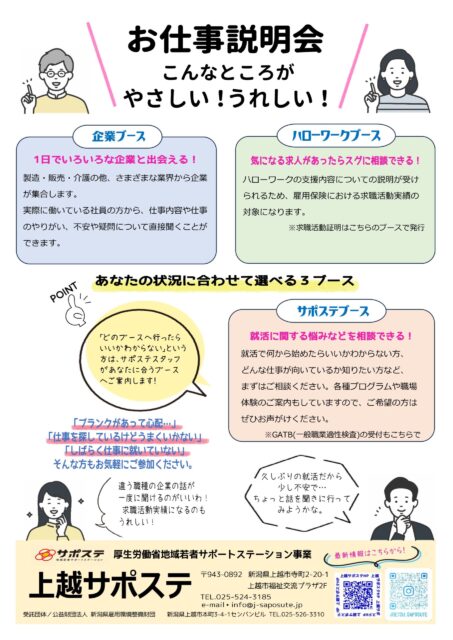 初めて企業説明会に参加する方や、就職にブランクがある方、仕事探しに不安を感じている方でも気軽に参加できます。